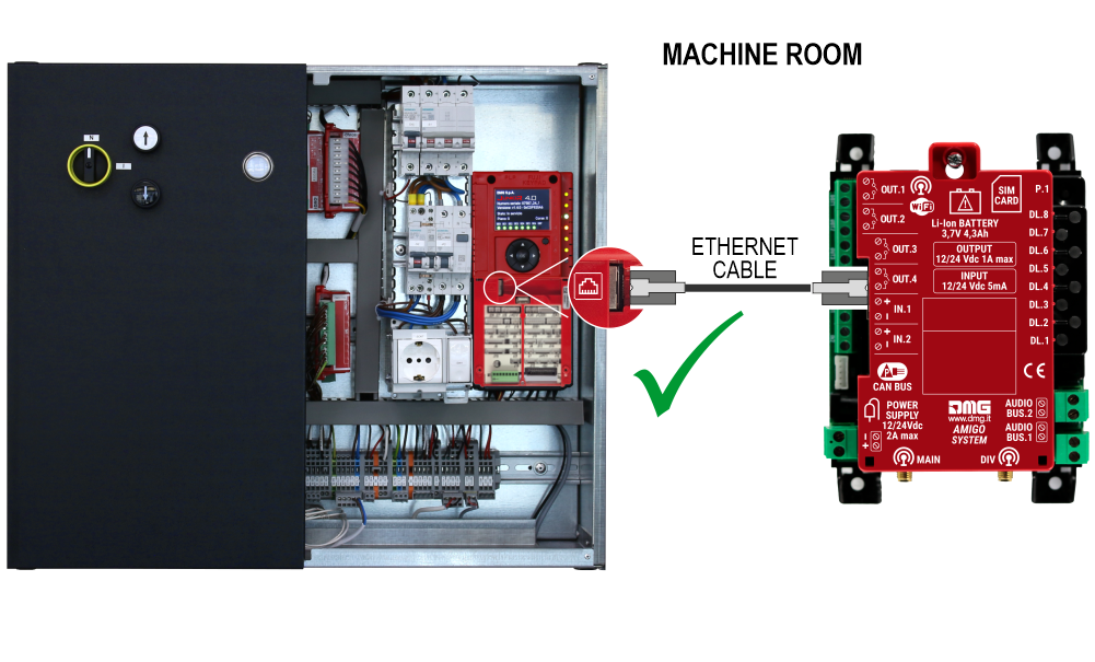 The system includes a router equipped to initiate emergency calls over both 4G (VoLTE) and GSM 2G networks using a SIM card. The device integrates a backup battery that ensures the autonomy required by the EN 81-28 standard.