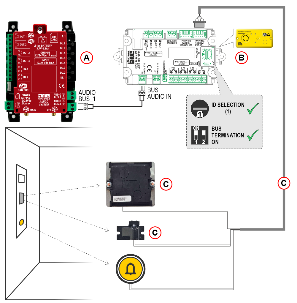 To enable intercommunication between the several audio devices, the main device (dialer / router) generates two digital BUS two-wire (2Wire) that carry power, audio signals, and data. This results in simplified wiring, reducing the number of wires compared to the use of travelling cables that typically carry multiple wires, and easing installation.