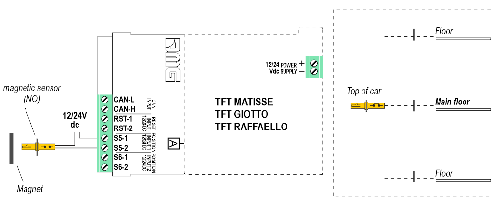b) – 1 magnetic sensor (Normally Open / Closed) on the cabin + 1 magnet at main floor for the RESET.