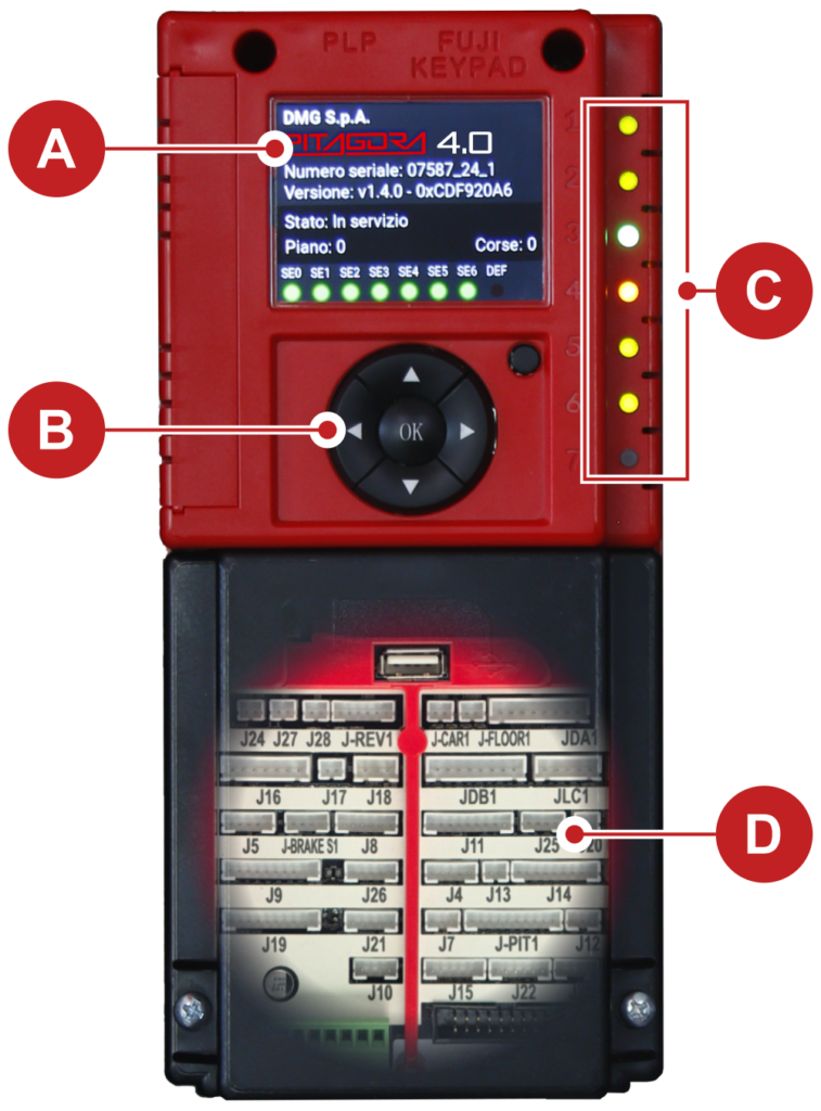 | J26 | Optional Boards | DMG Optional board for: - Parallel Prewired Pushbuttons (PIT8) - 16 relays output Board (16RL): The expansion card is necessary in particular to drive parallel displays (1 Wire / Floor, 1 Wire / Segment, Gray Code, binary) as the direct outputs available - 16 Input/Output Board (16IO) |