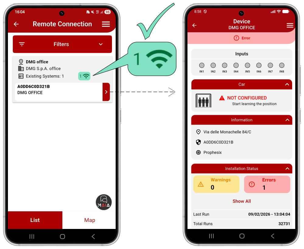 - Check that the device appears in your device list and that it is connected (green icon).