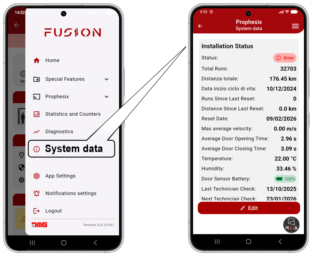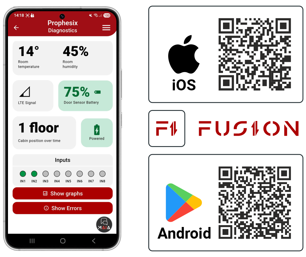 The main informations about the elevator status are displayed on the main page of the FUSION app.
