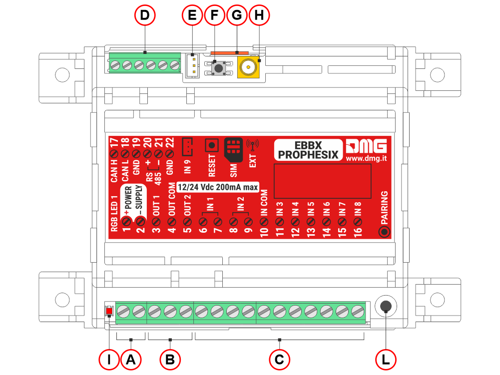 A) Power supply input (12/24Vdc 200mA max)