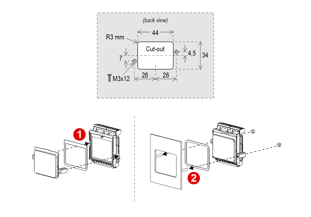 Фронтальный монтаж на панели с кнопками 0,7/2 мм